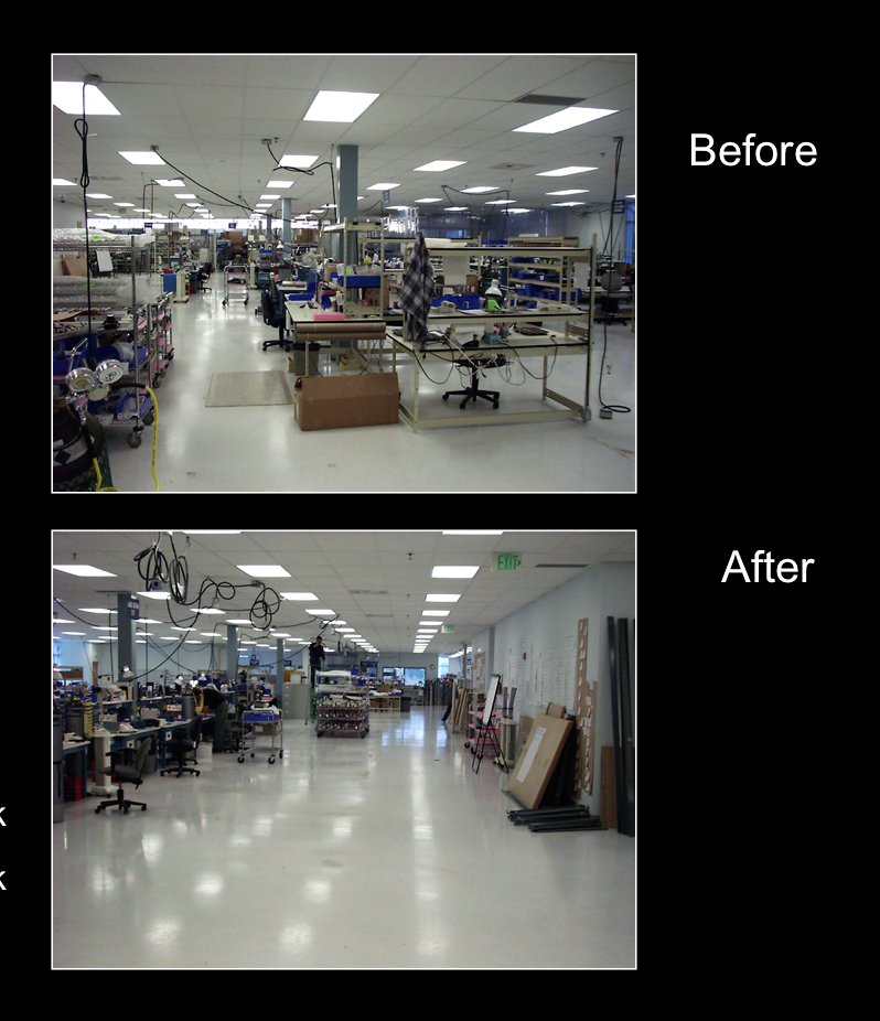 After implementing the new line flow, assembly lead-time was reduced from 17 days to just 15 hours. Productivity increased from 17 to 20 units per week, and this was based on real demand. The space needed for assembly was reduced from 2585 square feet to only 700 square feet. More impressively, we increased the productivity of engineering, assembly, and shipping staff by 367% and reassigned staff to other research projects. When we began, they had $156,000 worth of work-in-process inventory on the line. After implementing our new line flow, they reduced this to $52,000 for a savings of $104,000.